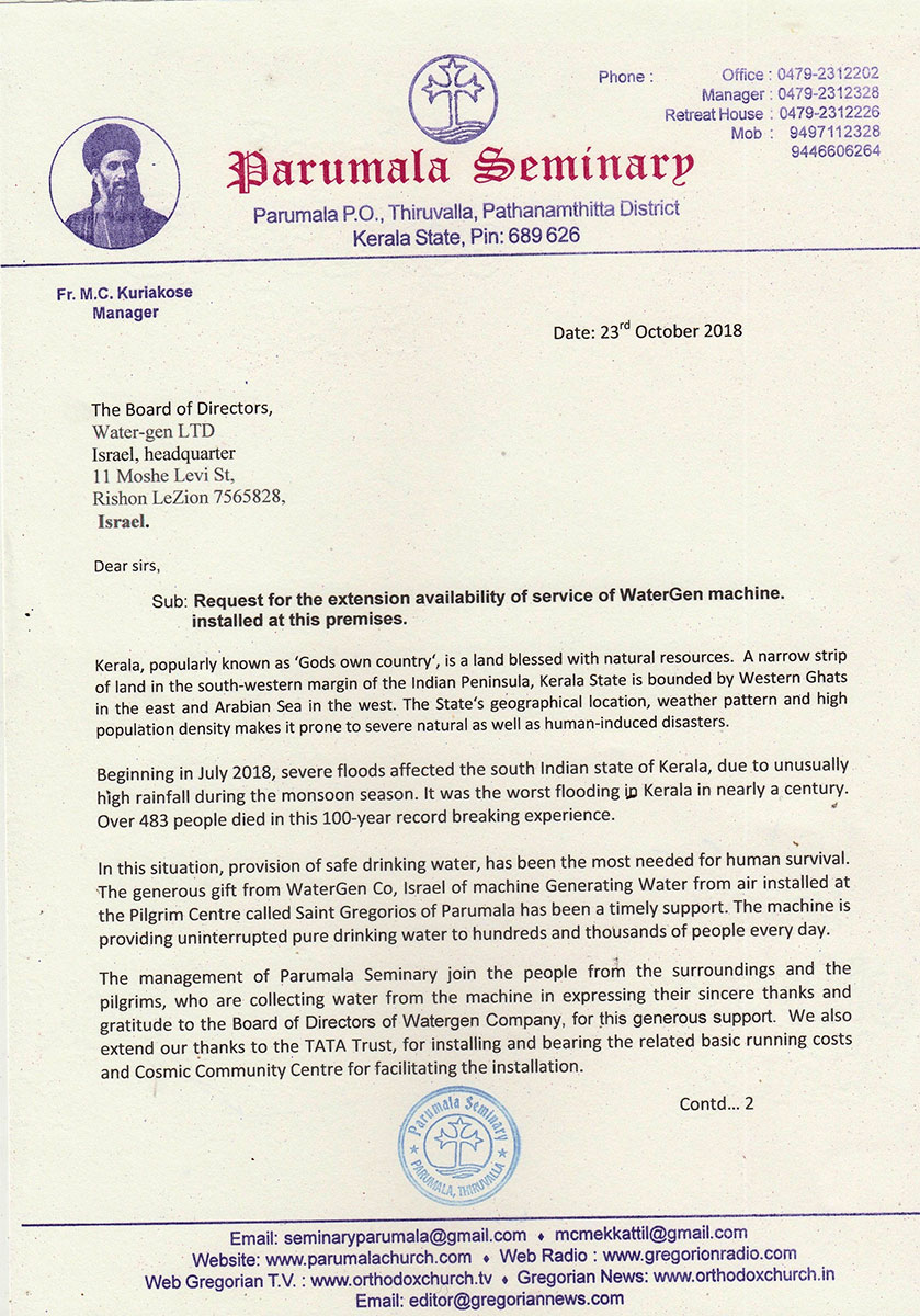 Watergen and TATA Trusts stepped in to help with the relief efforts, and two GEN-350 units were installed in the region – one in Alappuzha, and the other in the Christian seminary village of Parumala in the Pathanamthitta district.