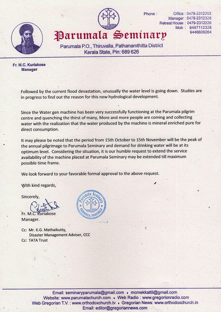 Following a special request by the seminary manager, Father MC Kariakose, GEN-350 continues to operate in Kerala, providing fresh, clean water for staff and visitors until today.